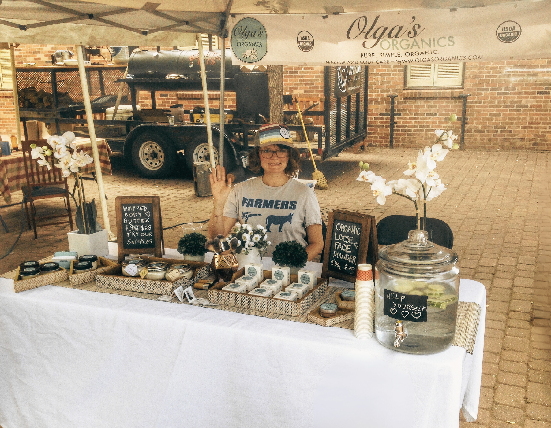 Here's Olga at the Carbondale, Colorado Farmers Market in 2016 offering her first two products of Organic Face Powder, and Organic Body Whips.